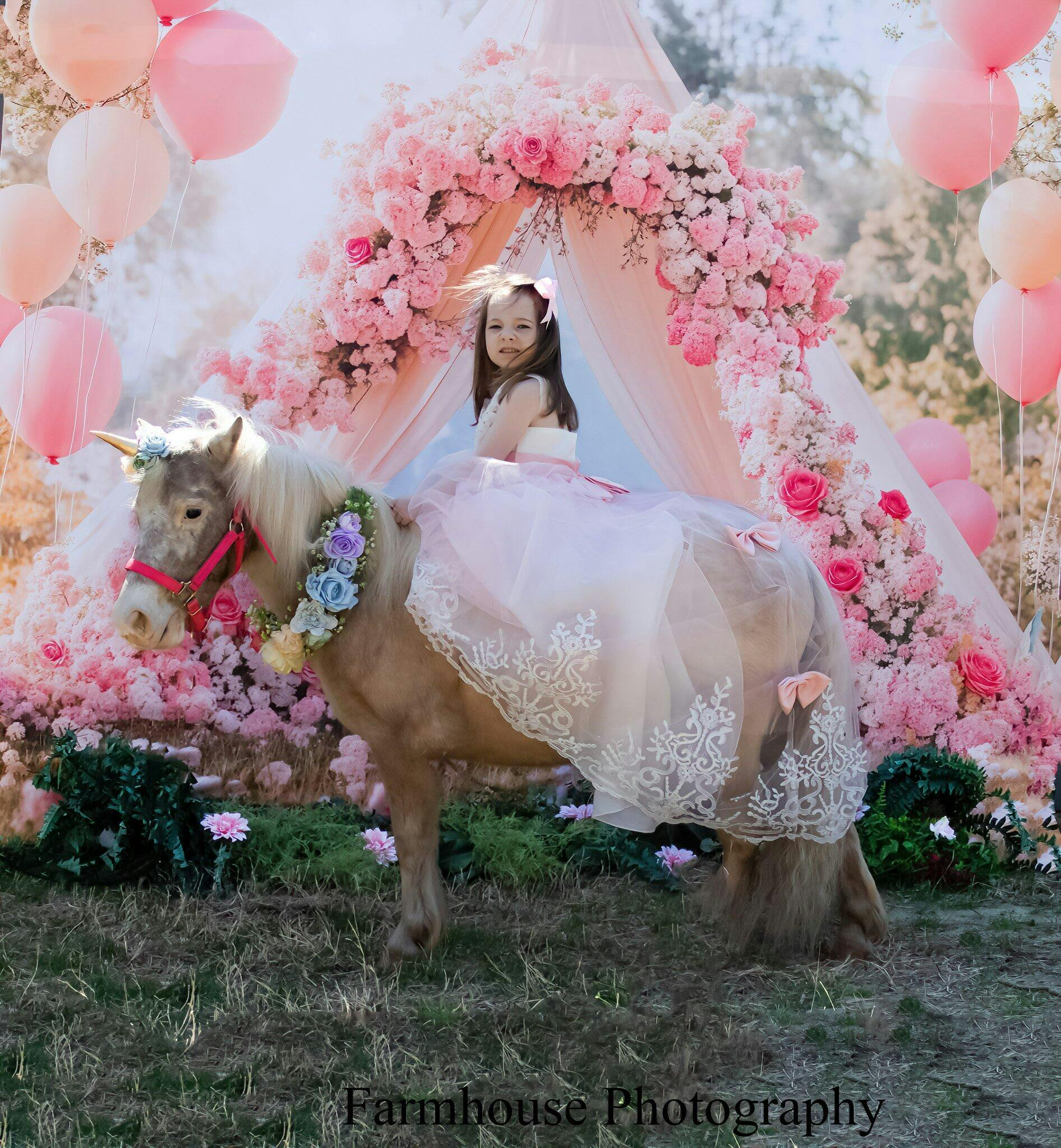 Create enchanting moments with the Blossom Dream Floral Teepee Backdrop. This delicate setup features soft pastel balloons and a teepee framed in lush pink blossoms, perfect for capturing whimsical and romantic portraits. Ideal for events seeking a dreamy, nature-inspired aesthetic.