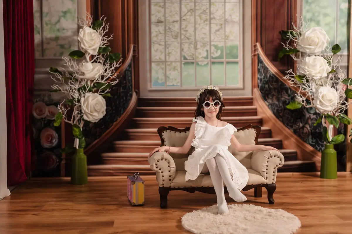 Enhance your portrait sessions with the Elegant Vintage Staircase Floral Backdrop, featuring a grand arched window and soft floral accents. This unique backdrop adds timeless charm and sophistication, perfect for capturing memorable moments with classic elegance and natural light ambiance.