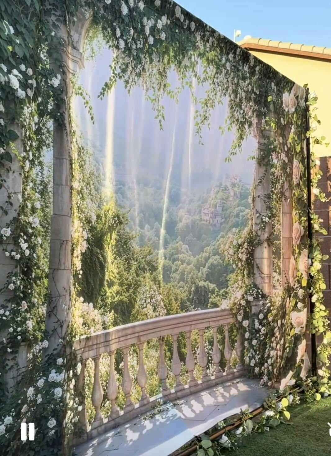 Enhance your photoshoots with the Romantic Garden Balcony Floral Backdrop, featuring lush greenery, delicate white roses, and a breathtaking scenic vista. This elegant backdrop creates an enchanting atmosphere perfect for weddings, portraits, and special occasions, making every shot memorable and beautiful.
