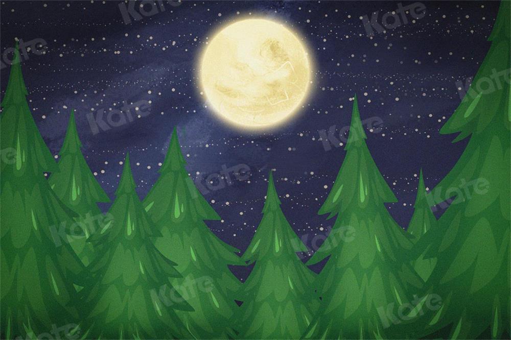Transform your photos with the enchanting charm of the Mystical Moonlit Evergreen Forest Backdrop. This beautifully illustrated scene features towering pine trees under a starry night sky illuminated by a glowing full moon, creating a magical atmosphere perfect for unique portrait settings.