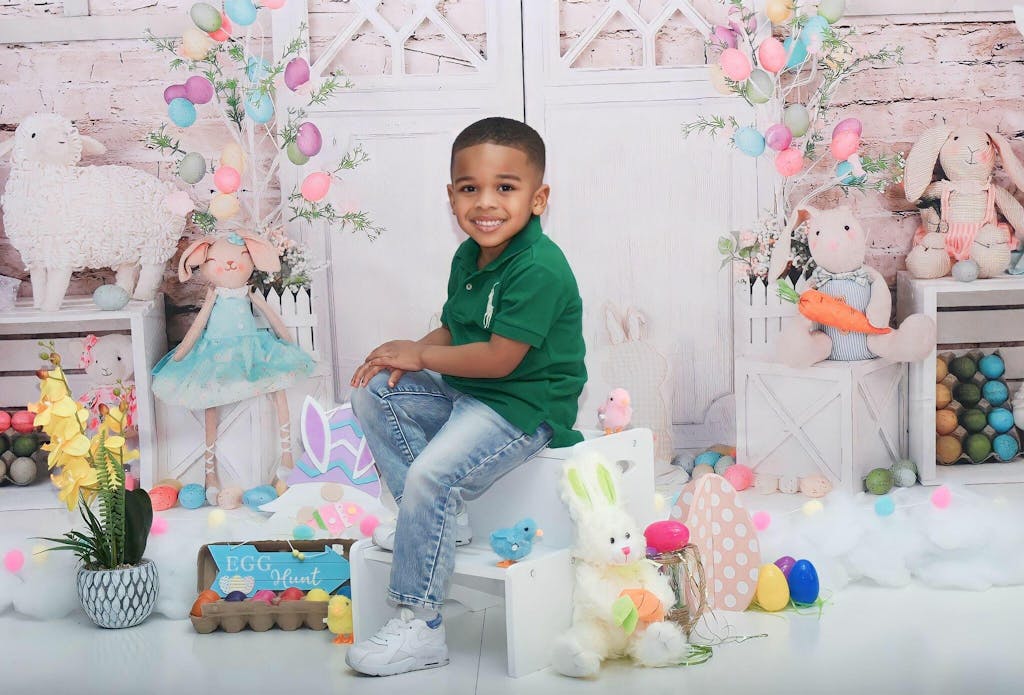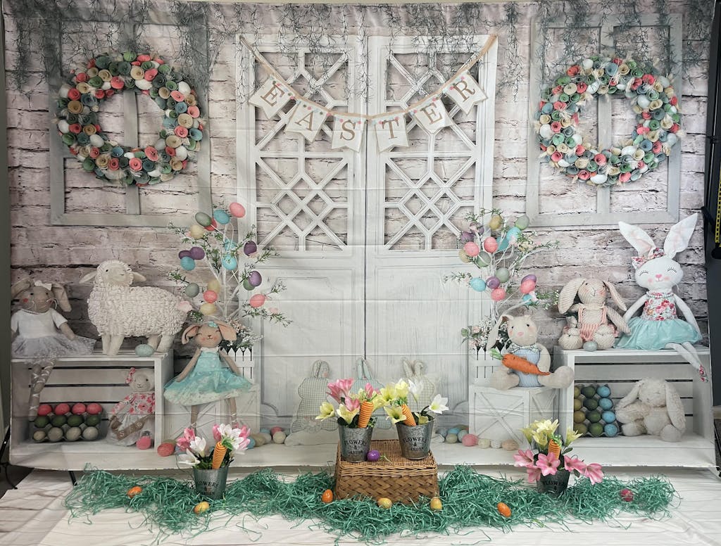 Capture charming springtime moments with the Pastel Easter Bunny & Floral Backdrop. This beautifully detailed backdrop features adorable bunny decorations, pastel floral wreaths, and colorful Easter eggs, perfectly designed for festive and joyful portraits. Ideal for creating vibrant, memorable Easter-themed photoshoots.