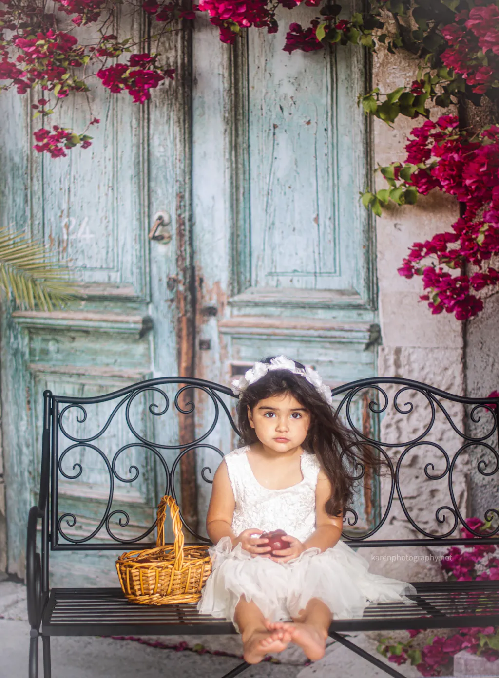 Enhance your photo sessions with the Rustic Blue Door with Vibrant Bougainvillea backdrop. Featuring an aged turquoise door framed by lush pink bougainvillea blossoms, this backdrop brings a charming vintage Mediterranean vibe perfect for adding depth and color to portraits and creative shoots.