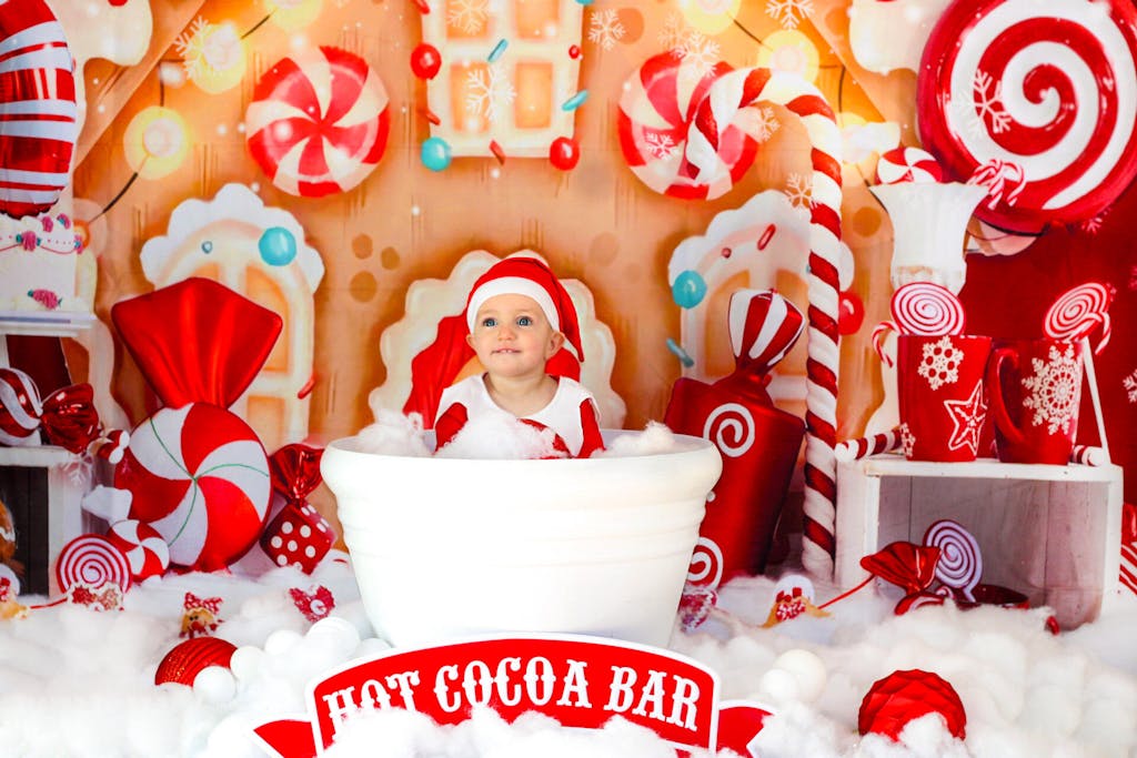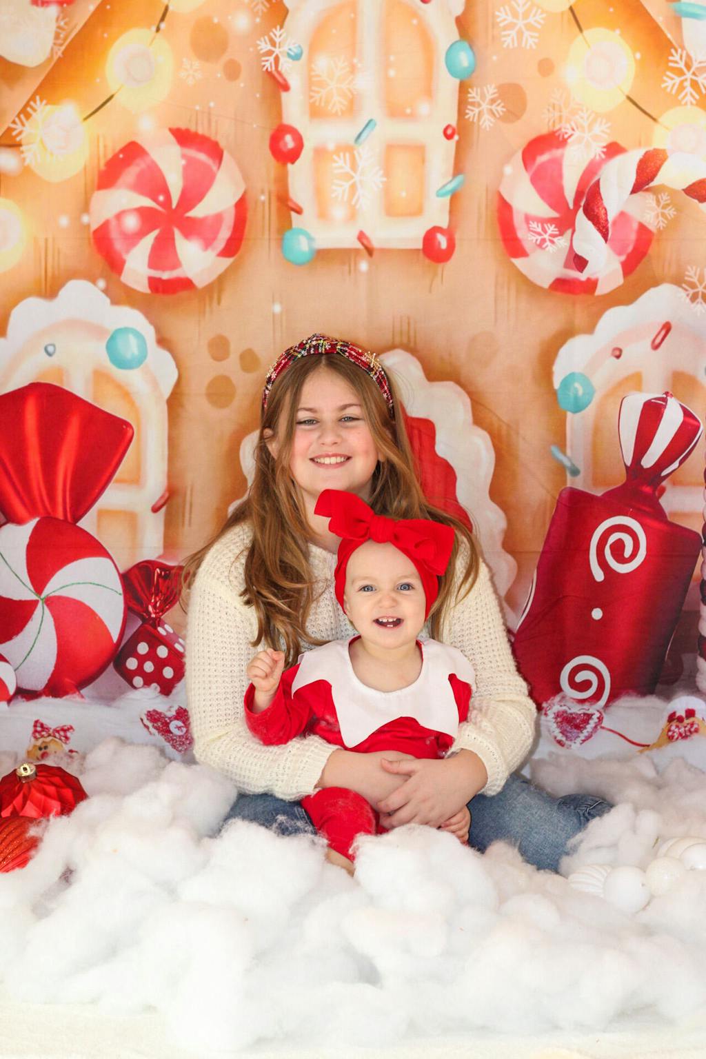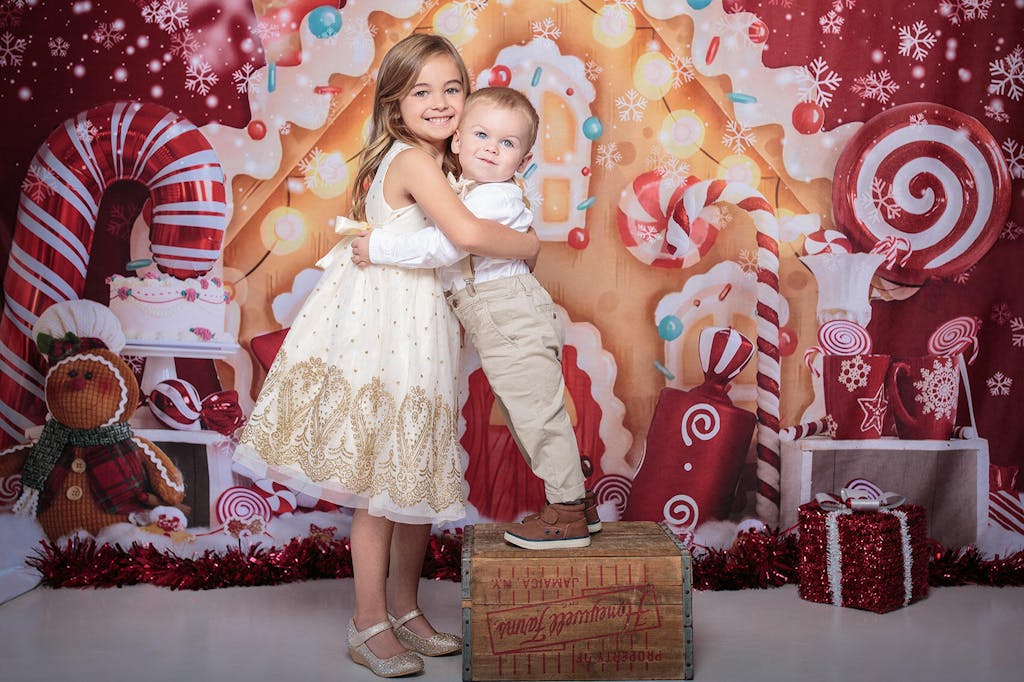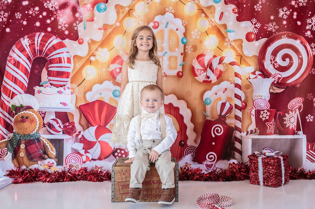 Create magical holiday moments with the Kate Christmas Gingerbread Backdrop. Featuring vibrant candy canes, sparkling lights, and gingerbread charm, this backdrop transforms any scene into a whimsical winter wonderland perfect for festive portraits and seasonal photography.