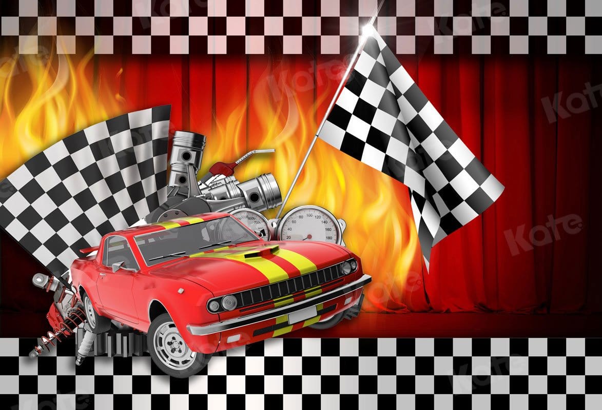 Ignite the energy of any photo session with the Racing Flames Retro Muscle Car Backdrop. Featuring a vintage red muscle car, vibrant flames, and checkered racing flags, this backdrop brings dynamic motion and excitement to your portraits, perfect for car enthusiasts and racing fans alike.