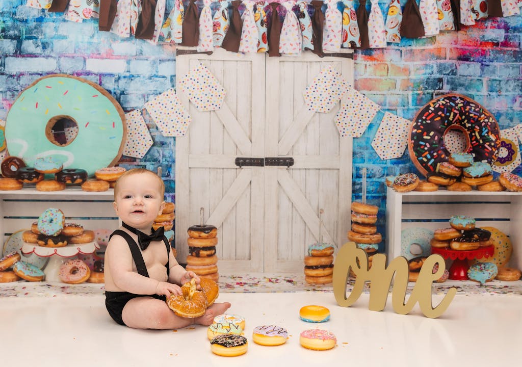 Capture joyful moments with the Vibrant Colorful Donut Celebration Backdrop. Featuring a lively, multicolored brick wall with delightful donut-themed decorations, this backdrop adds a fun and playful atmosphere perfect for parties and photo sessions. Its eye-catching design ensures your portraits stand out with sweetness and style.