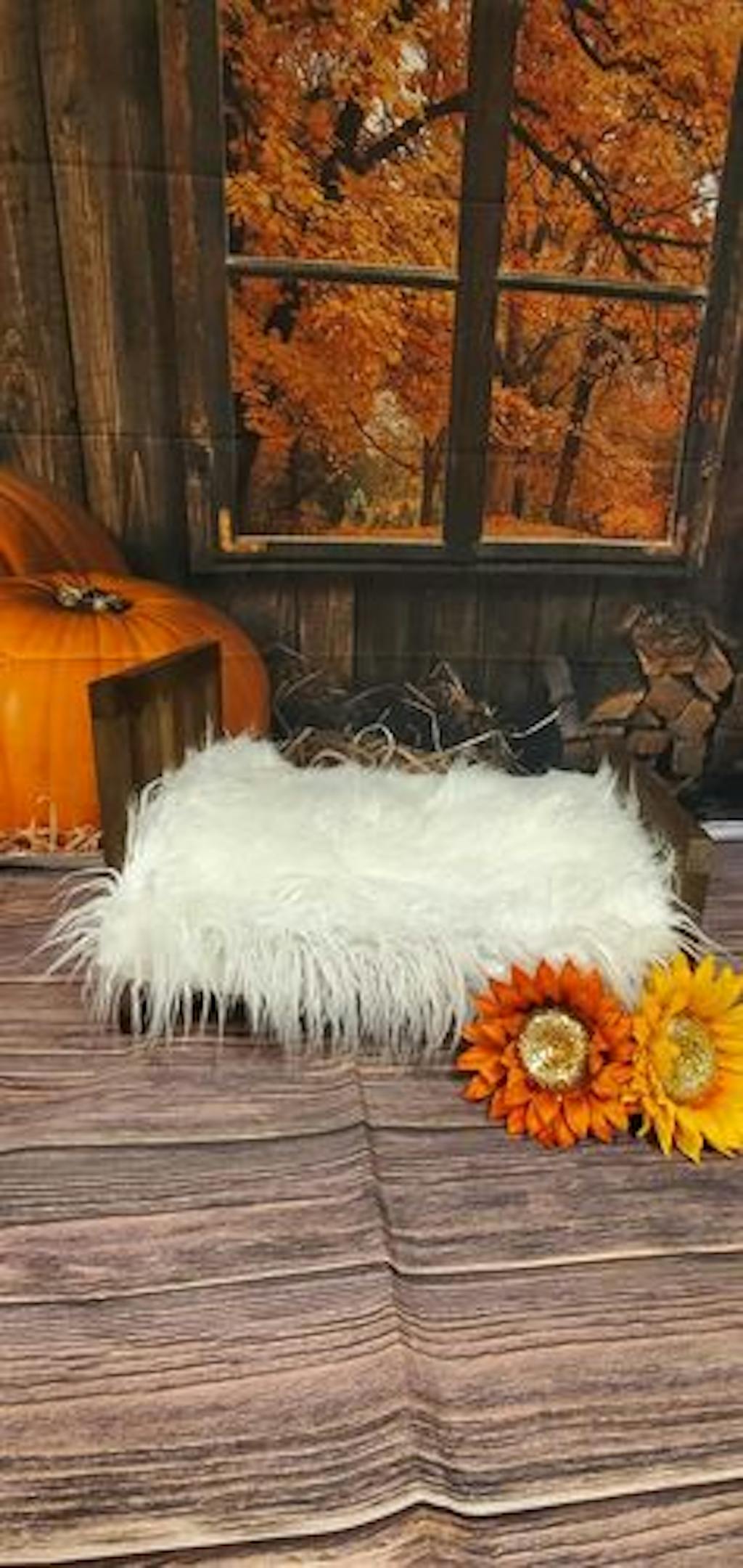 Enhance your seasonal photos with the Rustic Autumn Harvest Pumpkin Backdrop, showcasing vibrant fall foliage through a vintage window frame paired with warm pumpkins and natural wood textures. Perfect for creating cozy and festive autumn portraits that capture the essence of harvest time.