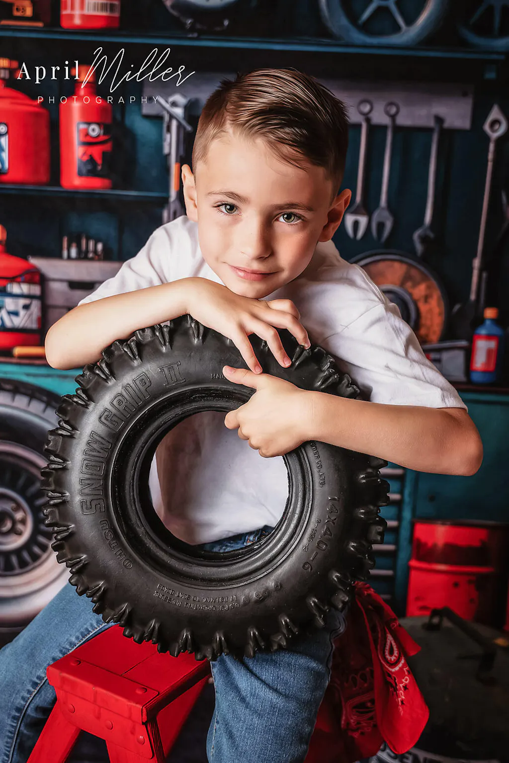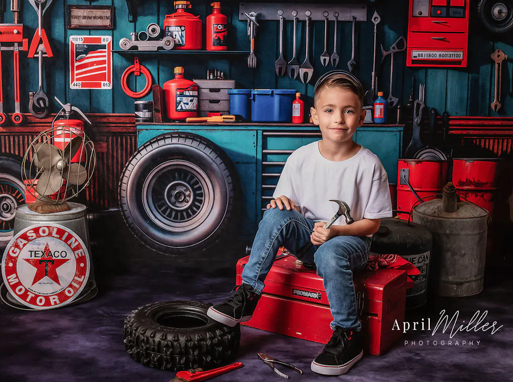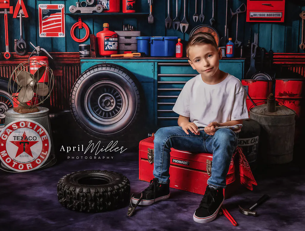Kate Modern Tool Holder and Tires Red Tanker Garage Printed Backdrop Designed by Emetselch