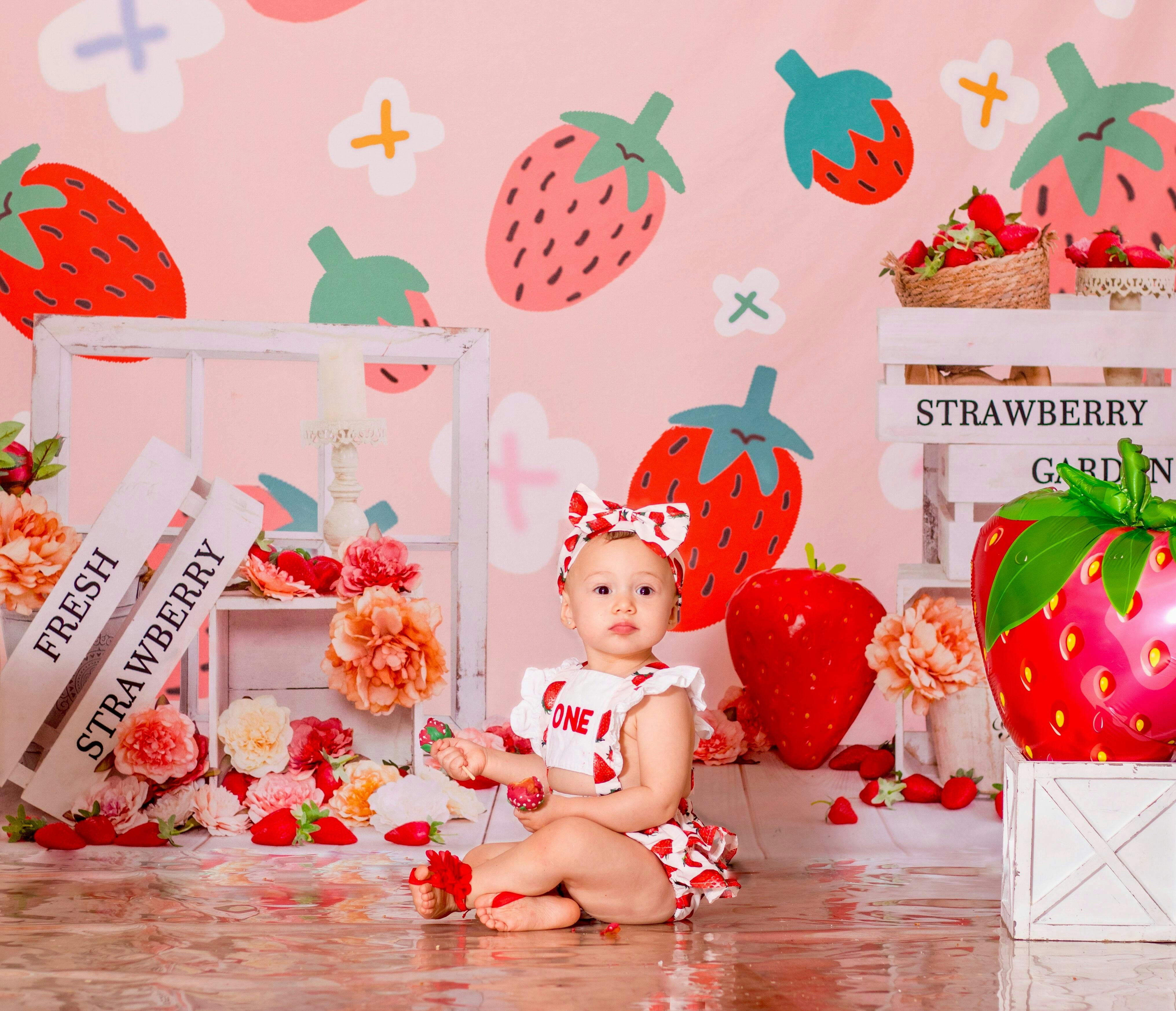 Elevate your photography with the Playful Strawberry Pattern Photo Backdrop. Featuring charming strawberry illustrations on a soft pink background, this backdrop adds a fresh and whimsical vibe to your shoots. Perfect for creating vibrant, eye-catching portraits with a joyful, fruity theme.